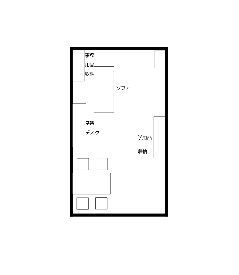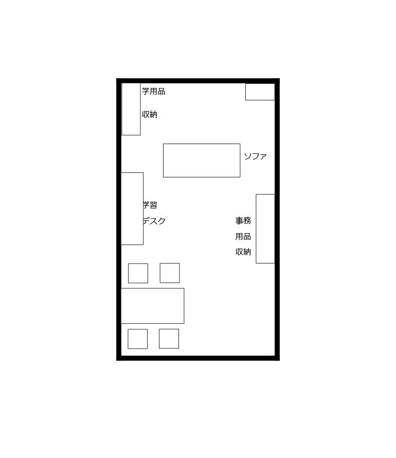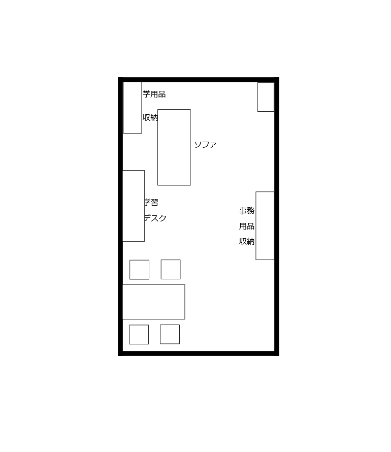 ソファが部屋の中央に居座っており、学習デスクと学用品収納(ランドセル置き場)が横並びになっています。